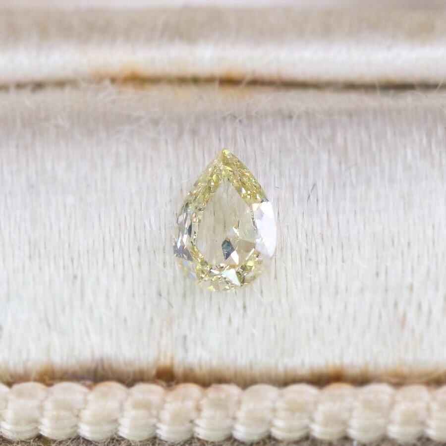 柔らかなイエローグリーンの透明感が上品な、ペアシェイプローズカットのダイヤモンドです。透き通るような透明感と、カットから生まれる繊細な煌めきが美しいピースです。バラの蕾に似ていることから名付けられた「ローズカット」はオールドカットの一種で、三角の面がキラリと反射して、ウルウルとした煌めきを内側から放ちます。