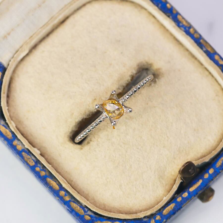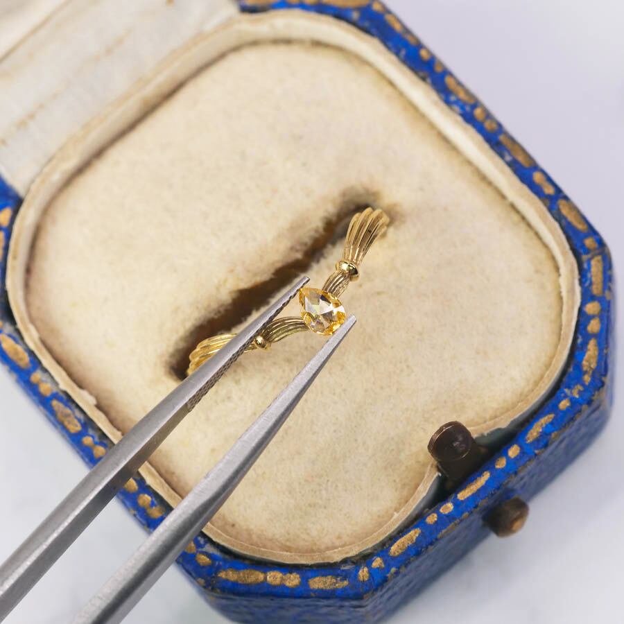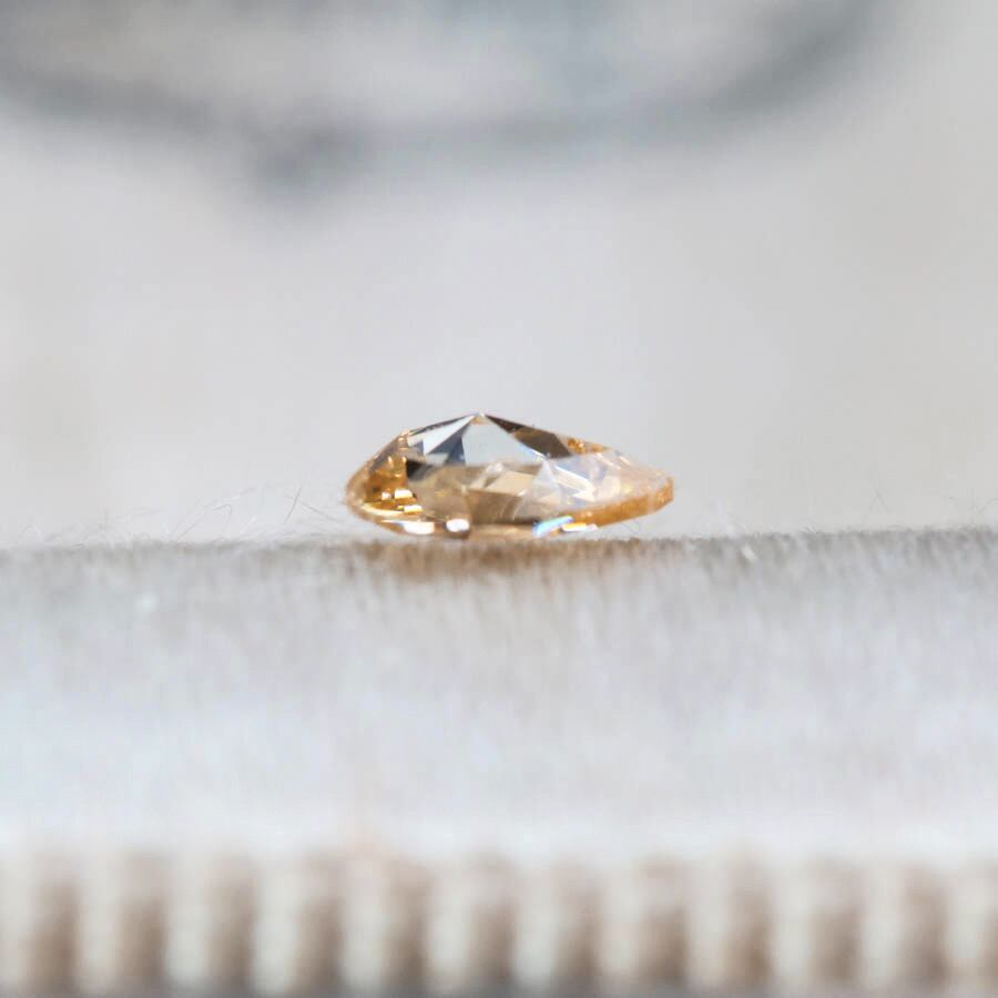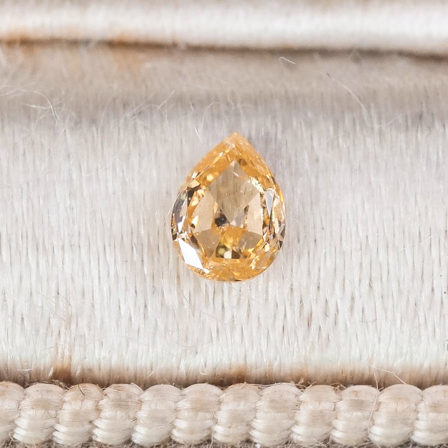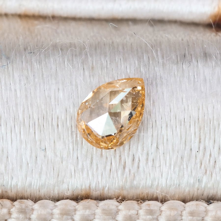 ピンクを噛んだオレンジカラーが明るい印象の、ペアシェイプローズカットのダイヤモンドです。肉眼で見て目立つ内包物はなく、透き通るボディが美しいピースです。バラの蕾に似ていることから名付けられた「ローズカット」はオールドカットの一種で、三角の面がキラリと反射して、ウルウルとした煌めきを内側から放ちます。