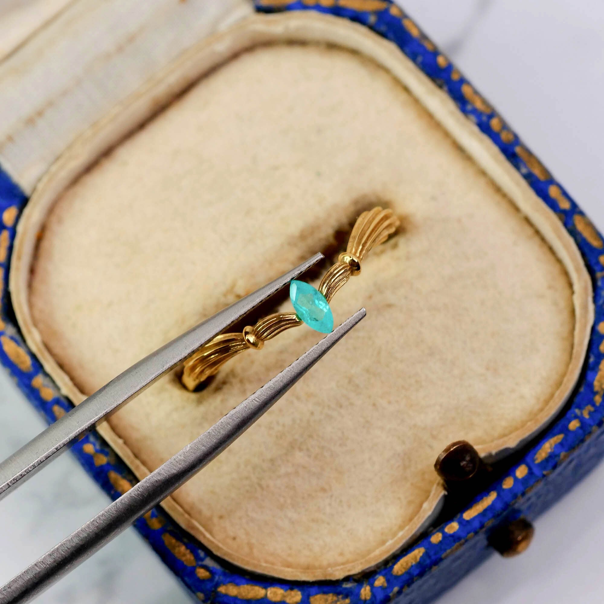 爽やかで存在感のあるライトブルーが凛とした美しさを放つ、マーキスカットのパライバトルマリンです。ルーペで拡大しますと、細やかなインクルージョンが確認できますが、すっきりとしたフォルムに広がる、鮮やかな色彩と煌めきが印象的なルースです。