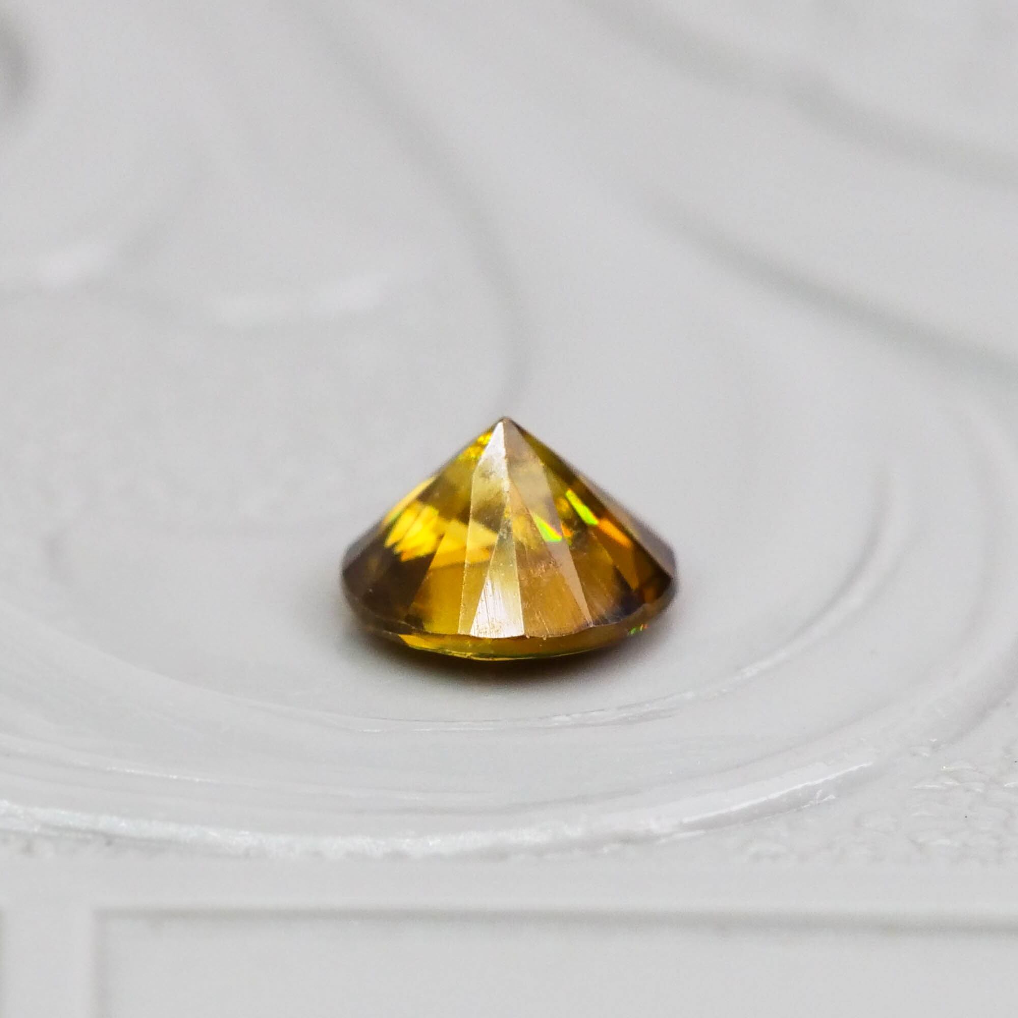 濃厚で深みのある黄色の色彩が美しくきらめく、ラウンドカットのスフェーンです。コントラストの効いた色彩の明暗や、華やかに広がるファイアの煌めきがゴージャスな印象のピースです。