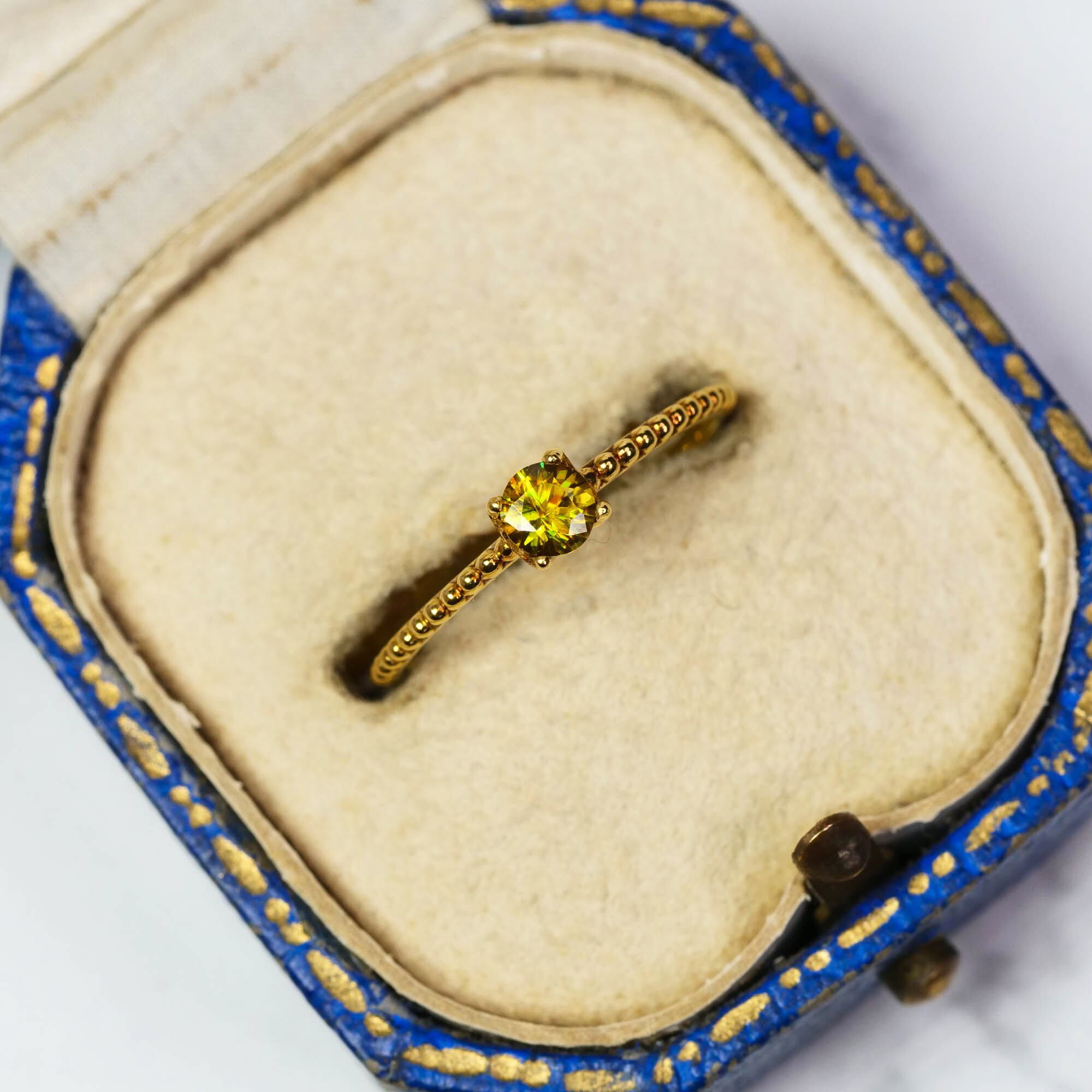 スフェーンは太陽光の下やライトの下で目が覚めたかのように虹色のファイアを煌めかせるのが美しい宝石です。室内と自然光で表情が変わるのをお楽しみください。