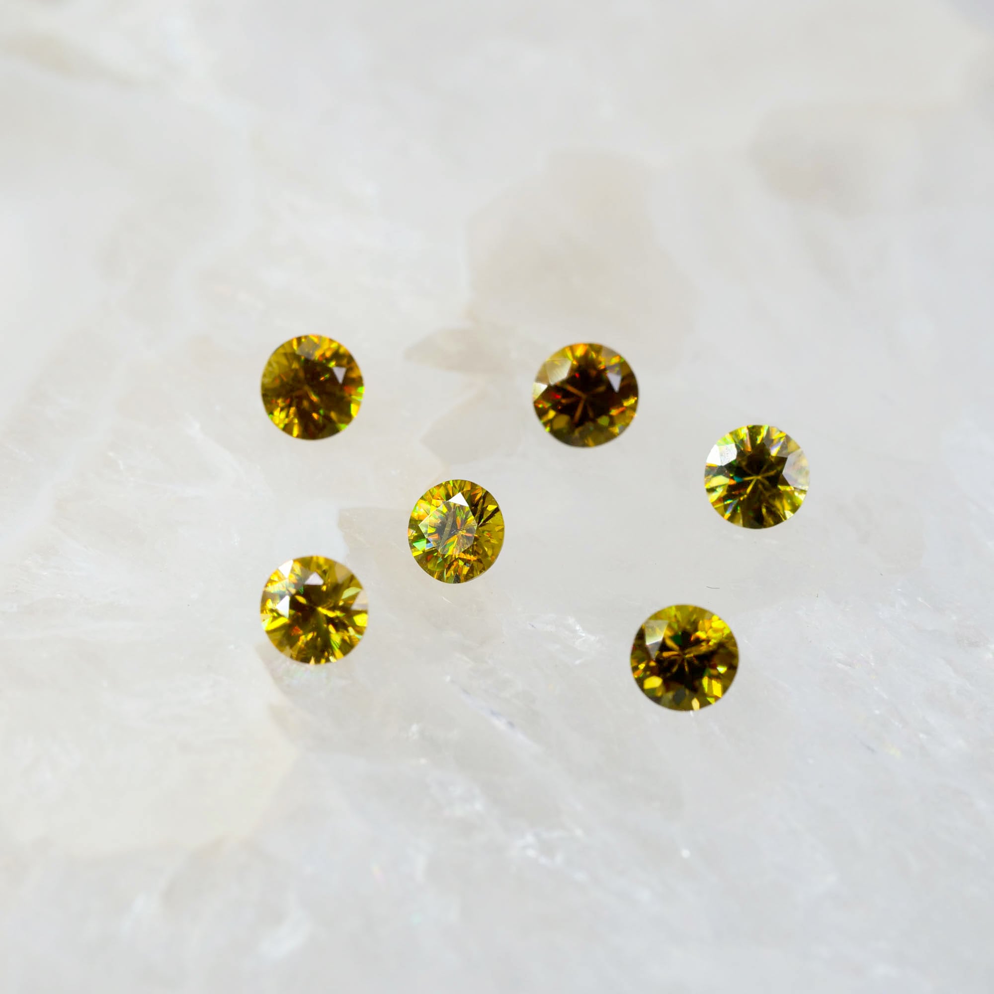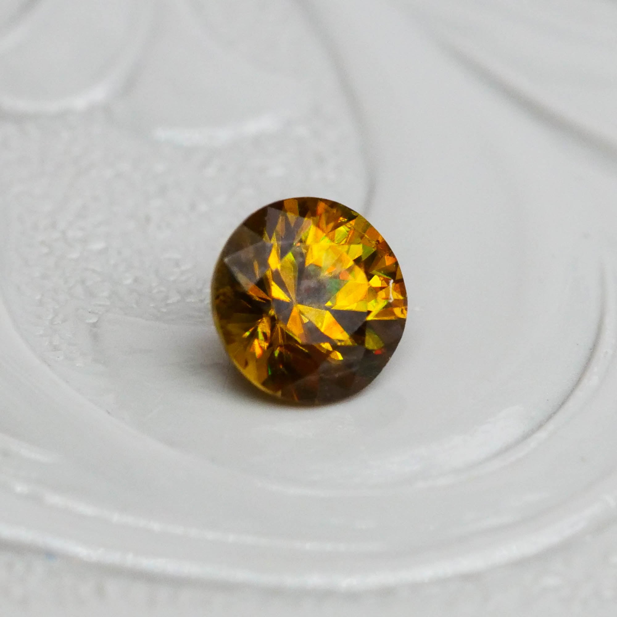 ほんのりオレンジを噛んだイエローの温かみのあるカラーが優しい印象の、ラウンドカットのスフェーンです。大人っぽい印象の色彩にファイアの華やかさがプラスされ、より一層上質な雰囲気が漂うピースです。