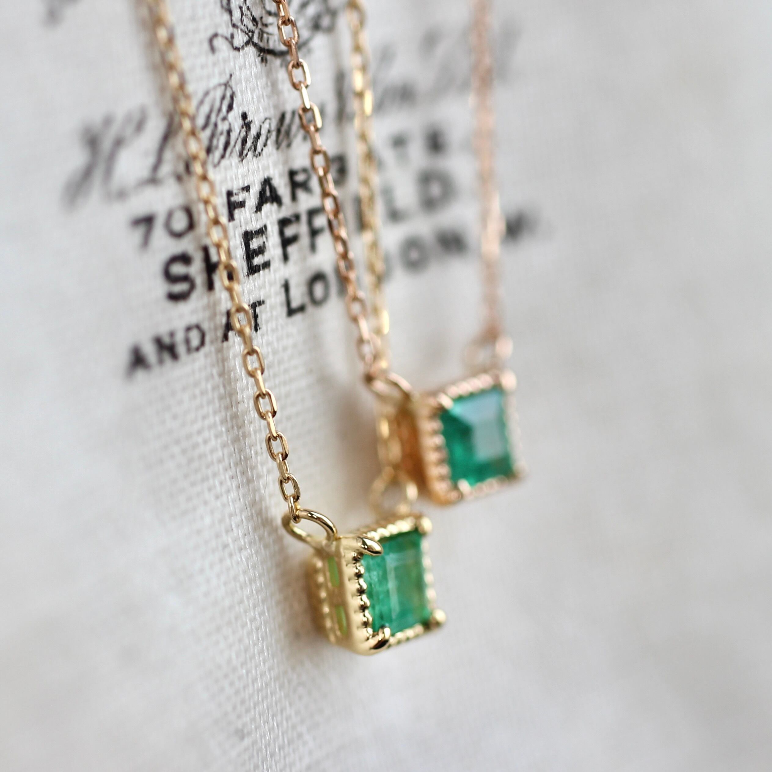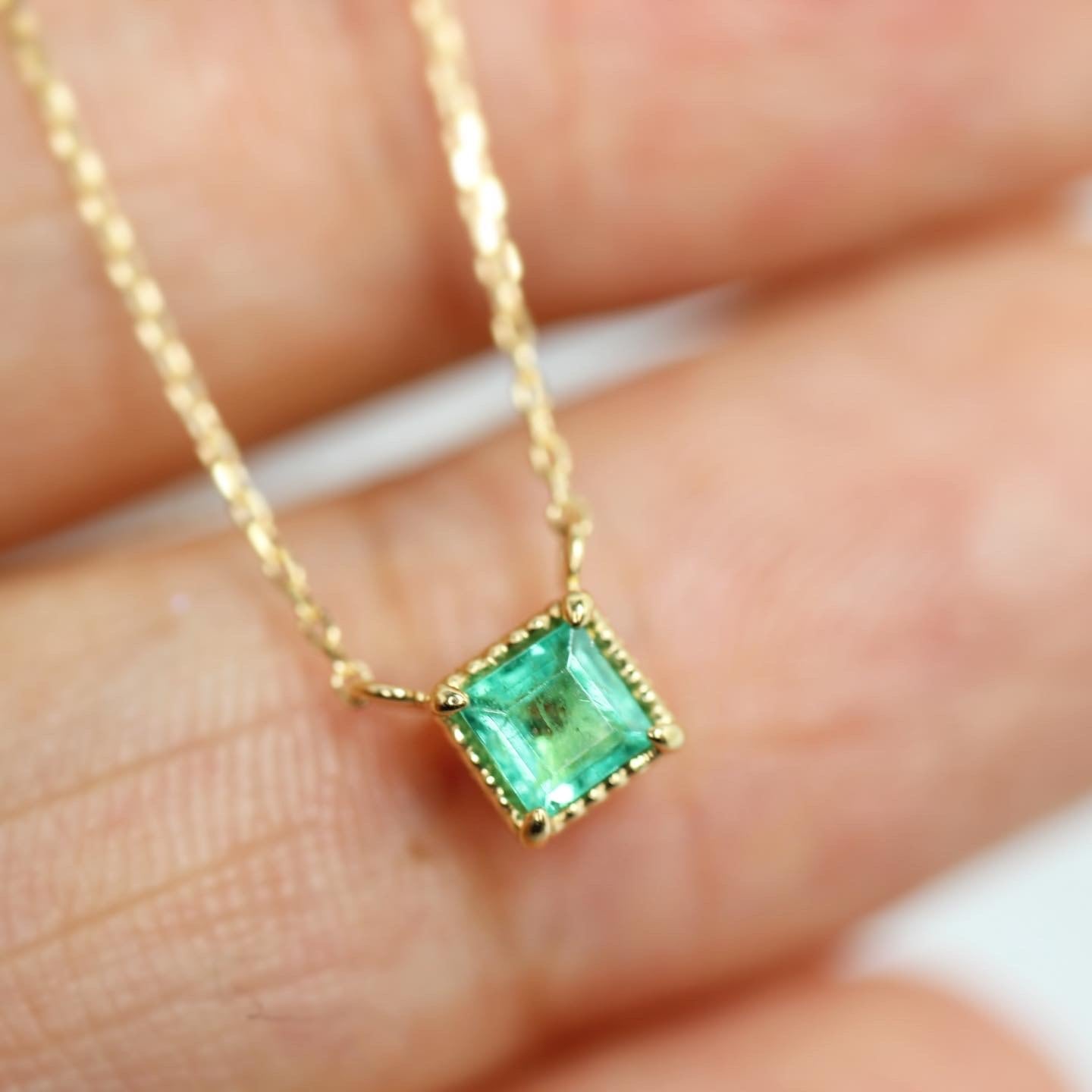 3mm×3mmのエメラルドが美しいネックレスです。トップのサイズは4mm×4mmです。