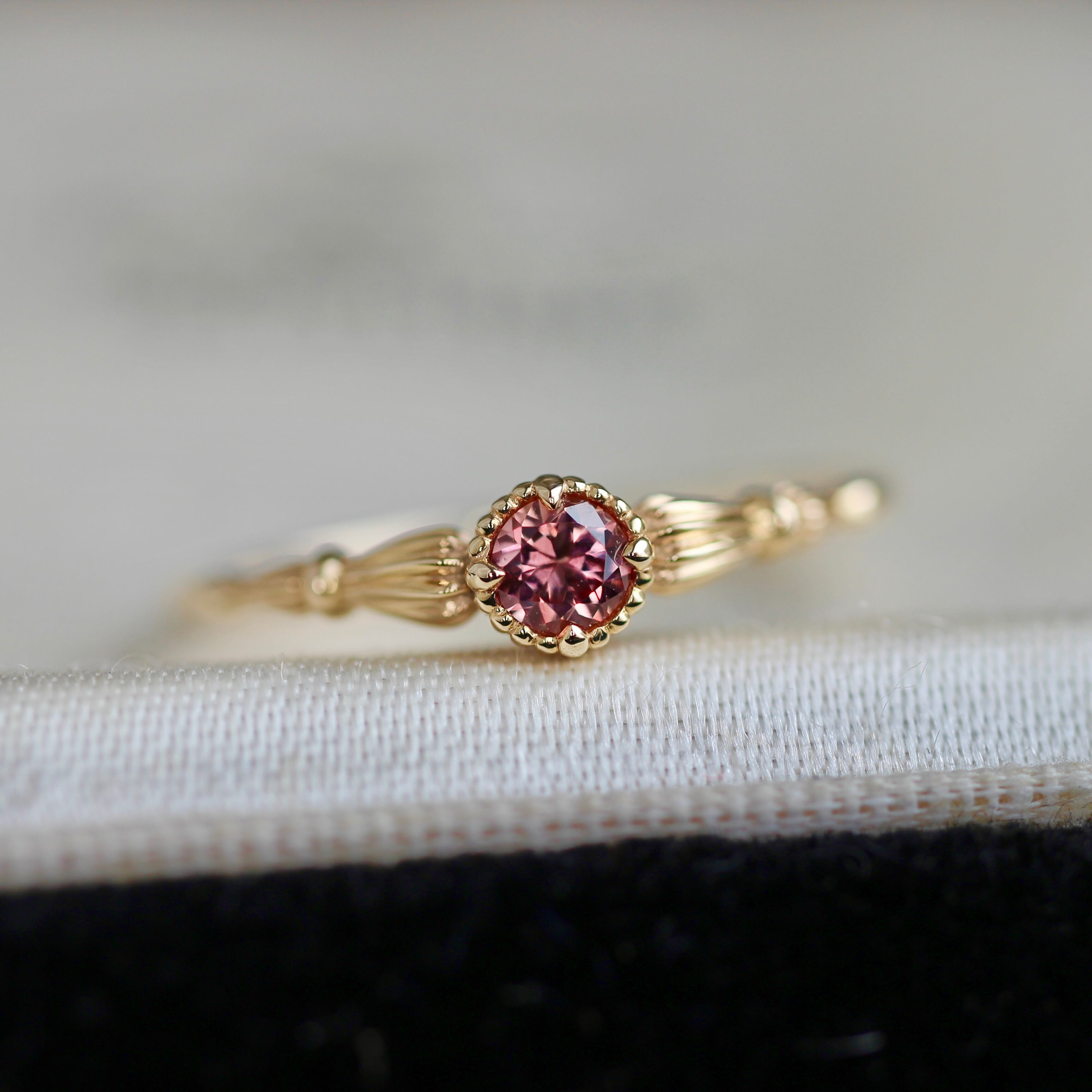 ギリシャ神殿の支柱のに施されている溝(フルーティング)からインスパイアされたアンティーク調のアームに、石枠は4本爪でルースをセットした周りに細やかなミル細工を施したミルフレームのデザインです。